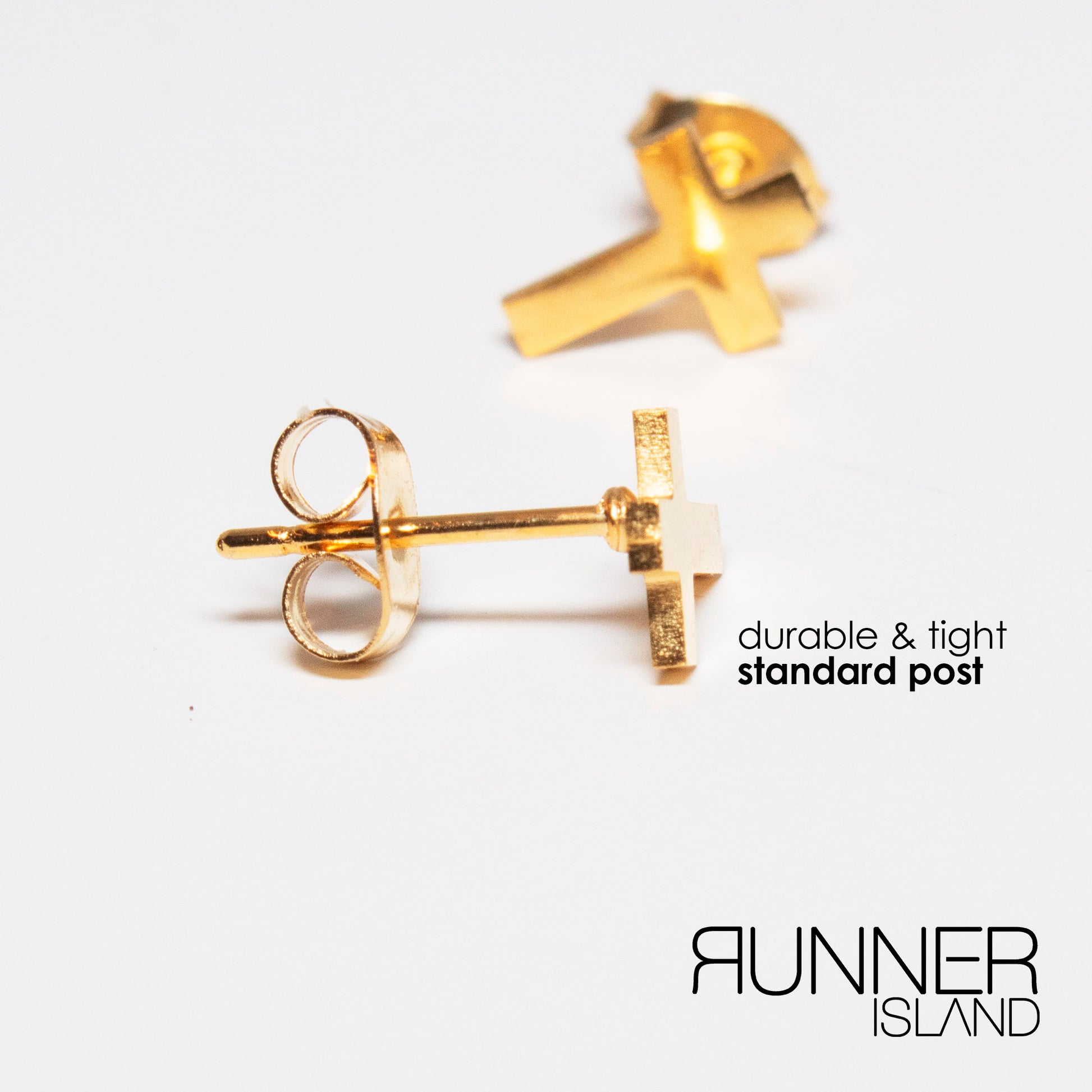 The Runner Island Mini Cross Stud Earrings feature a measurement of about 0.33 inches. Our small cross earrings are designed with a gold-tone stainless steel, waterproof, sweat resistant, and tarnish free. They're the perfect Christian jewelry gift for runners, tennis players, track & field achievers and more!