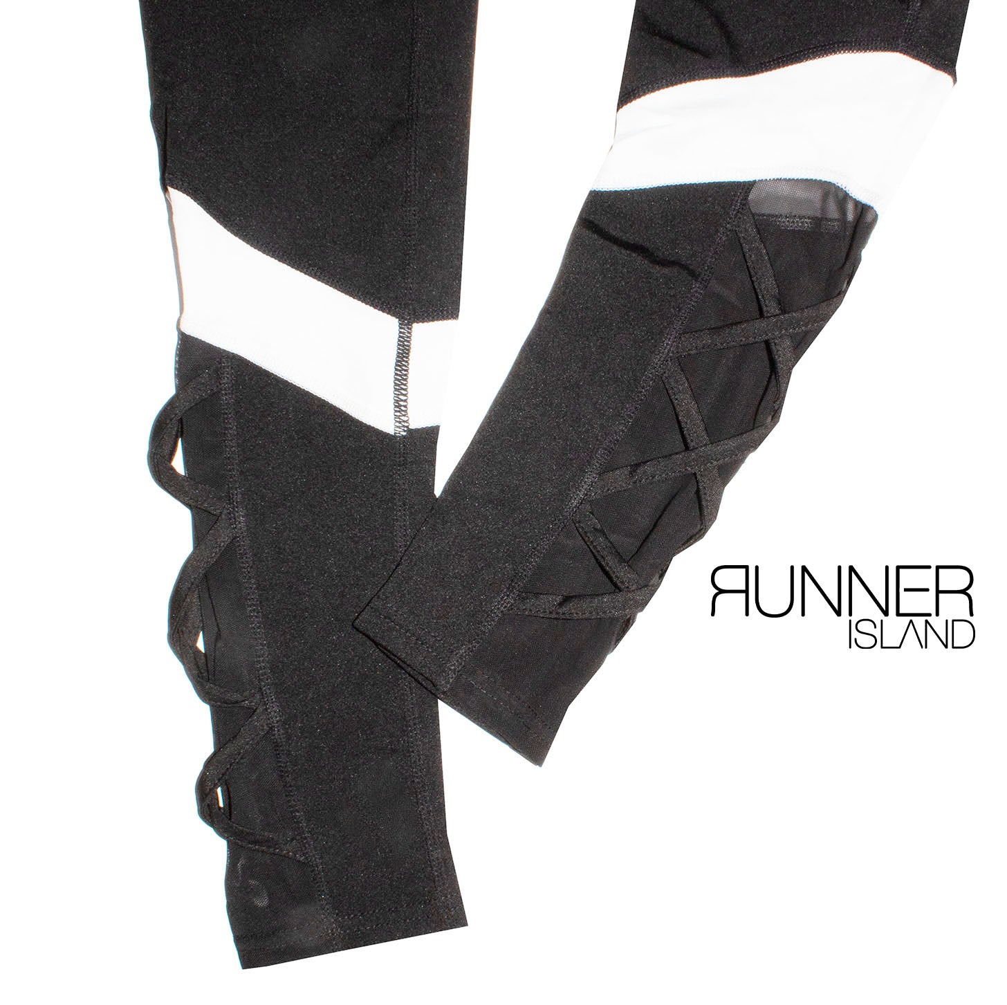 The Runner Island Women's Black Sports Leggings with Back Zipper Pocket are a must-have for running, track and field, or tennis. It features a rear reflective zipper pocket, built-in elastic waistband for staying on, and a trendy white cuff - black mesh criss cross design on each calf muscle.