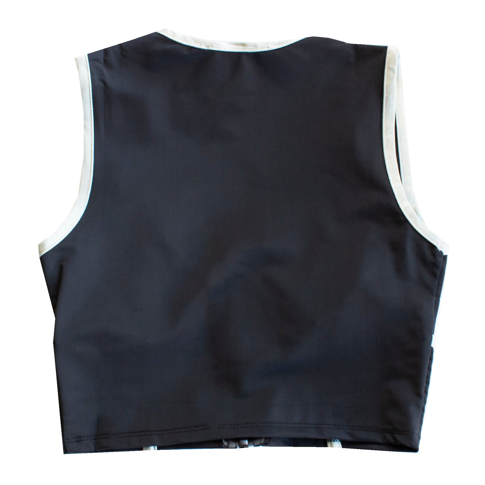 A Runner Island workout crop top that features luxurious water-resistant fabric for running & swimming, high visibility accents, adjustable front zipper and compression.