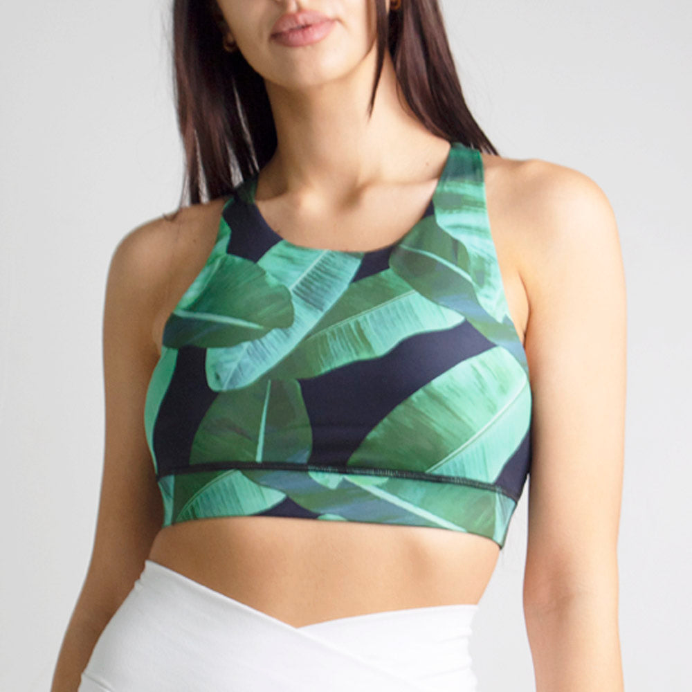 The Runner Island Women's Palm Tree Run to Swim Sports Bra features cool & moisture wicking fabric blends for swimming, running, & tennis-- the triathlete's dream.